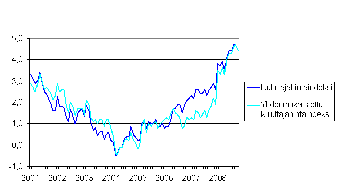 Kuluttajahintaindeksin ja yhdenmukaistetun kuluttajahintaindeksin vuosimuutokset 2001-10/2008