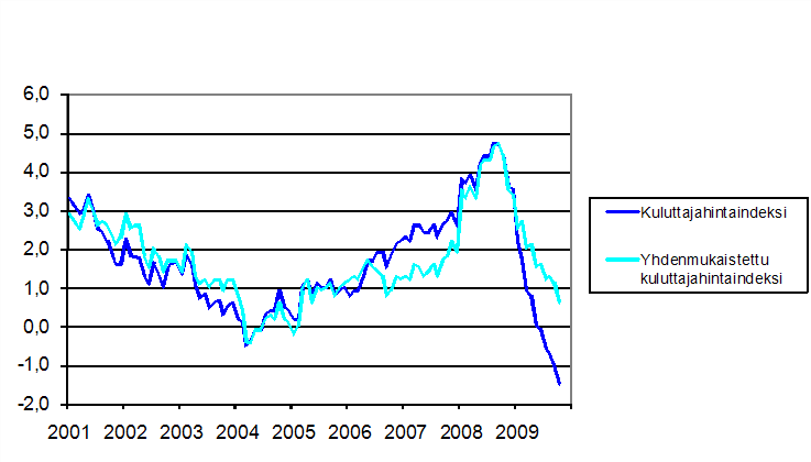Kuluttajahintaindeksin ja yhdenmukaistetun kuluttajahintaindeksin vuosimuutokset 2001-10/2009