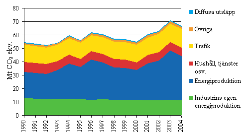 Växthusgasutsläpp inom energisektorn åren 1990-2004 (Mt CO2 ekv.)