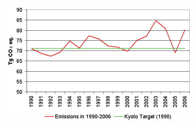 Figure 4. Greenhouse gas emission in Finland in 1990 - 2006 in relation to the target level of the Kyoto protocol (base year 1990) (Tg CO2 eq.)