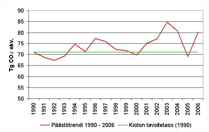 Kuva 4. Kasvihuonekaasujen päästötrendi 1990 - 2006 suhteessa Kioton pöytäkirjan tavoitetasoon (vuosi 1990).