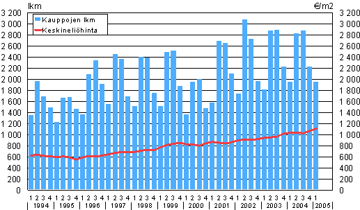Omakotitalokauppojen lukumäärät ja keskineliöhinnat 1994/1-2005/1