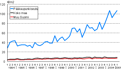 Omakotitalotonttien keskineliöhinnat 1994/1-2005/1