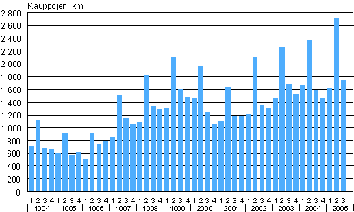 Omakotitalotonttien kauppojen lukumäärät 1994/1-2005/3
