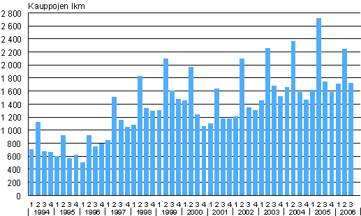 Omakotitalotonttien kauppojen lukumäärät 1. neljännes 1994 - 3. neljännes 2006