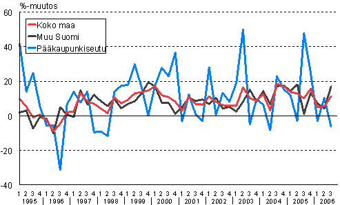 Omakotitalotonttien nimellishintaindeksin vuosimuutos 1. neljännes 1995 - 3. neljännes 2006