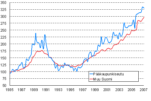 Omakotitalojen hintakehitys 1. neljännes 1985 - 1. neljännes 2007, indeksi 1985=100