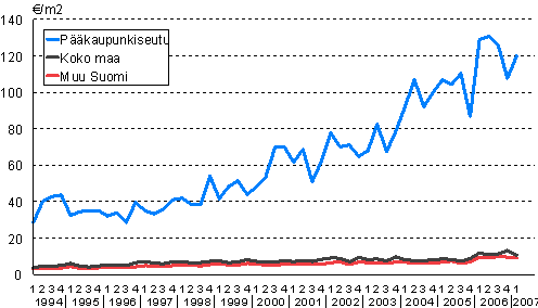 Omakotitalotonttien keskineliöhinnat 1. neljännes 1994 - 1. neljännes 2007