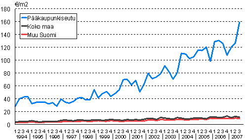 Omakotitalotonttien keskineliöhinnat 1. neljännes 1994 - 3. neljännes 2007