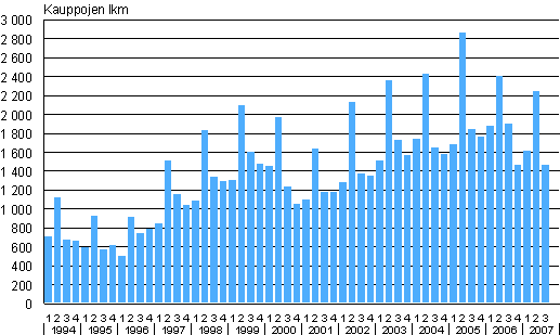 Omakotitalotonttien kauppojen lukumäärät 1. neljännes 1994 - 3. neljännes 2007