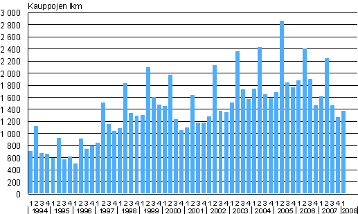 Omakotitalotonttien kauppojen lukumäärät 1. neljännes 1994 - 1. neljännes 2008