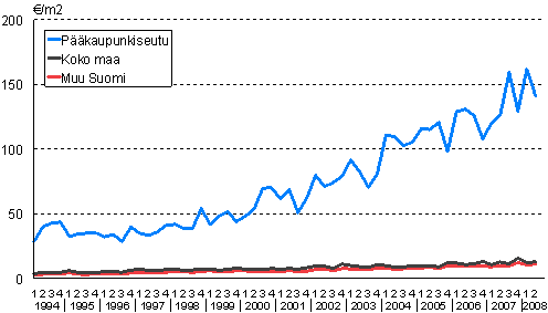 Omakotitalotonttien keskineliöhinnat 1. neljännes 1994 - 2. neljännes 2008
