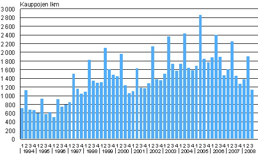 Omakotitalotonttien kauppojen lukumäärät 1. neljännes 1994 - 3. neljännes 2008