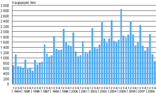 Omakotitalotonttien kauppojen lukumäärät 1. neljännes 1994 - 4. neljännes 2008