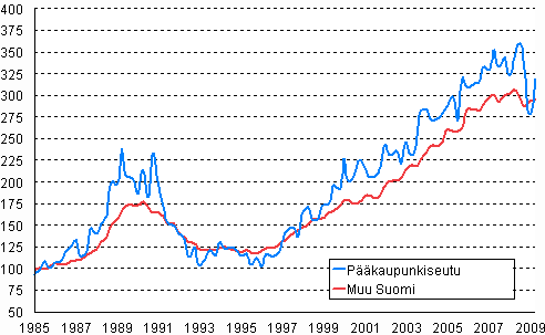 Omakotitalojen hintakehitys 1. neljännes 1985 - 2. neljännes 2009, indeksi 1985=100