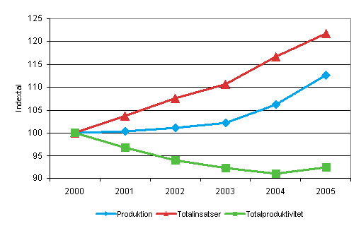 Utvecklingen av volymen av produktionen och totalinsatserna inom kommunernas och samkommunernas hälsovårdstjänster samt utvecklingen av totalproduktiviteten åren 2000-2005 (2000=100)