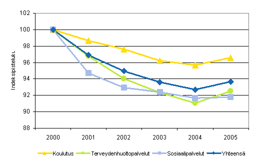 Kuntien ja kuntayhtymien koulutuksen, terveydenhuoltopalveluiden ja sosiaalipalveluiden kokonaistuottavuuden kehitys vuosina 2000-2005 (2000=100)