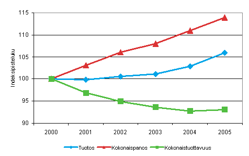 Kuntien ja kuntayhtymien koulutuksen, terveydenhuoltopalveluiden ja sosiaalipalveluiden tuotoksen volyymin, kokonaispanoksen volyymin ja kokonaistuottavuuden kehitys yhteensä vuosina 2000-2005 (2000=100)