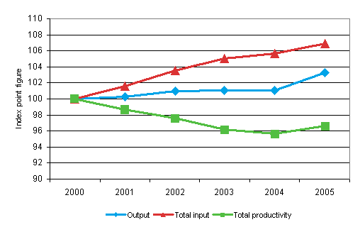 Development in the total productivity and the volumes of output and total input of education of local government in 2000-2005 (2000=100)