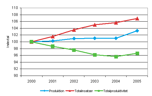 Utvecklingen av volymen av produktionen och totalinsatserna inom kommunernas och samkommunernas utbildning samt utvecklingen av totalproduktiviteten åren 2000-2005 (2000=100)