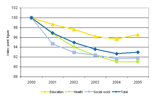 Development in the total productivity of education, health and social work of local government in 2000-2005 (2000=100)