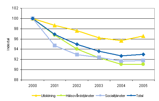 Utvecklingen av totalproduktiviteten inom kommunernas och samkommunernas utbildning, hälsovårdstjänster och socialtjänster efter näringsgrenar åren 2000-2005 (2000=100)