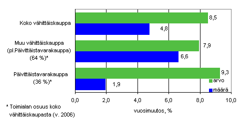 Vähittäiskauppa on kasvanut tasaisesti 2000-luvulla. Vuosien 2000-2006 aikana vuosikehitys on ollut 4,0-6,6 prosenttia. Vuonna 2006 liikevaihdolle kertyi kasvua 5,6 prosenttia edellisvuodesta ja vuoden 2007 kasvu kiihtyi 6,9 prosenttiin. Vuoden 2008 tammi-kesäkuussa liikevaihtoa kertyi 7,7 prosenttia enemmän kuin vastaavana ajanjaksona vuotta aiemmin.