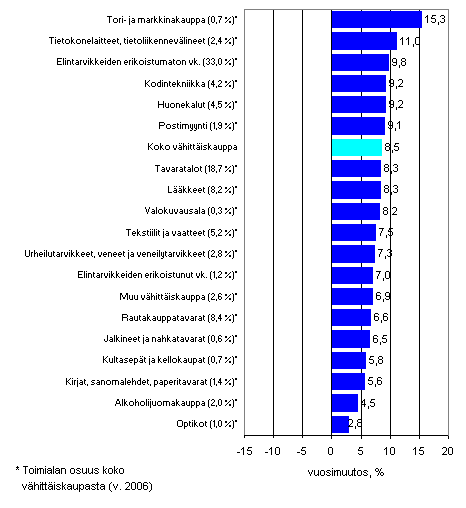 Vähittäiskaupan liikevaihto kasvoi toisella vuosineljänneksellä 8,5 prosenttia edellisvuodesta. Liikevaihto kohosi ripeästi tietokonelaitteiden ja tietoliikennevälineiden vähittäiskaupassa, jossa kasvu oli 11,0 prosenttia. Optisen alan vähittäiskaupan liikevaihto kääntyi maltilliseen 2,8 prosentin kasvuun huhti-kesäkuussa.