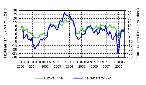Autokaupan liikevaihdon ja ajoneuvojen ensirekisteröintien kolmen kuukauden liukuvat vuosimuutokset