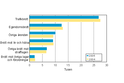 Enligt Statistikcentralen avgjordes 67 700 straffrättsliga ärenden vid tingsrätterna år 2005, dvs. 400 färre än året innan. Av de avgjorda ärendena var 57 607 egentliga brottmål och av dem var 55 524 brott mot strafflagen. Flest brottmålsrättegångar förorsakades av trafikbrott, som utgjorde 39,8 procent av alla brottmål. Av trafikbrotten var 12 627 grova rattfyllerier, vilket var fem procent färre än föregående år, och 8 129 var rattfyllerier.