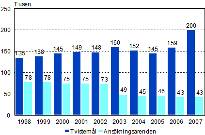 År 2007 slutbehandlades 242 756 civilmål i tingsrätterna, vilket var 20 procent mer än året innan. Av civilmålen var 199 876 tvistemål, dvs. 40 740 fler än året innan, och 42 880 ansökningsärenden. Av de avgjorda tvistemålen var nästan 57 procent mål som gällde skuld- och fordringsförhållanden, vilket är 47,9 procent mer än året innan. I den här gruppen av ärenden bokförs mål som gäller t.ex. konsumtionskrediter och kreditkortsfordringar. De därefter största grupperna var ärenden som gällde serviceavtal, uppdrag och avtal om arbetsresultat (13,1 %), ärenden som gäller lägenhetshyra (12,9 %) samt ärenden om lös egendom (12,8 %). Uppgifterna framgår av Statistikcentralens statistik över tingsrätternas avgöranden i civilmål.