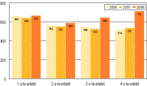 När de anhängiggjorda konkurserna granskas kvartalsvis ser man att konkurserna under år 2008 ökade under alla kvartal jämfört med år 2007. Dessutom tilltog ökningen i betydande grad mot slutet av året. Under det första kvartalet år 2008 ökade antalet konkurser med 4,2 procent och under det andra kvartalet med 6,9 procent. Under det tredje kvartalet var ökningen 23,0 procent och under det fjärde kvartalet redan 32,6 procent.