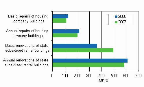 In 2008, housing companies and state-subsidised rental dwelling companies spent EUR 1.3 billion on repairs to their buildings, which is 5,6 per cent less than in 2007. These data derive from Statistics Finland's statistics on housing corporations' renovation building.