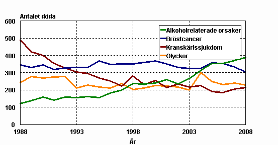Utvecklingen av de vanligaste dödsorsakerna bland arbetsföra (15-64) kvinnor 1988-2008: Alkoholrelaterade orsaker, bröstcancer, kranskärlssjukdom och olyckor