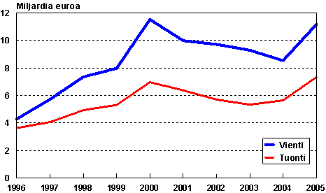 Suomen korkean teknologian tuotteiden ulkomaankaupan arvo vuosina 1996-2005