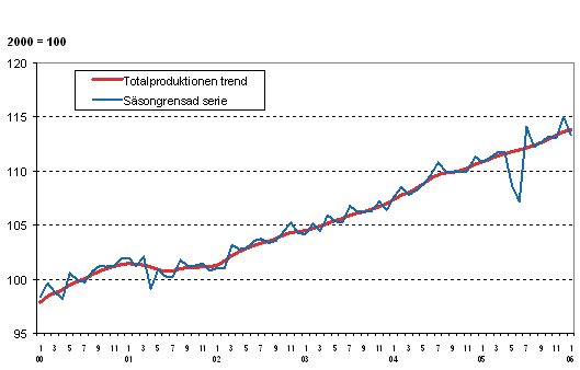I januari år 2006 ökade volymen av totalproduktionen med 3,3 procent jämfört med januari året innan. Av de sex huvudnäringarna i månadsgrafen sjönk bara primärproduktionen. I januari år 2006 fanns det en arbetsdag mer än i januari föregående år. Arbetsdagskorrigerat ökade volymen av totalproduktionen med 2,2 procent.