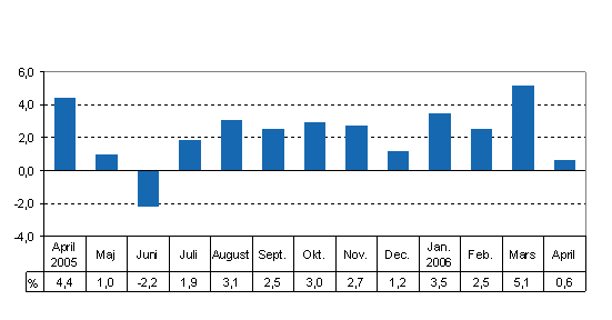 I april år 2006 ökade volymen av totalproduktionen med 0,6 procent jämfört med april året innan. I april år 2006 fanns det tre arbetsdagar mindre än i april föregående år. Den arbetsdagskorrigerade totalproduktionen ökade med 3,4 procent jämfört med året innan.