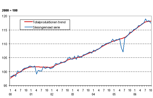 I oktober år 2006 ökade volymen av totalproduktionen med 3,3 procent jämfört med oktober året innan. Av de sex huvudnäringarna i månadsgrafen sjönk bara primärproduktionen. I oktober år 2006 fanns det en arbetsdag mer än i motsvarande månad föregående år. Den arbetsdagskorrigerade volymen av totalproduktionen ökade med 2,4 procent.