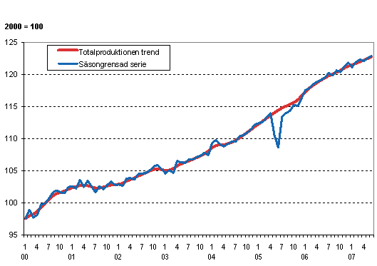 Volymen av totalproduktionen 2000-2007, trend och säsongrensad serie