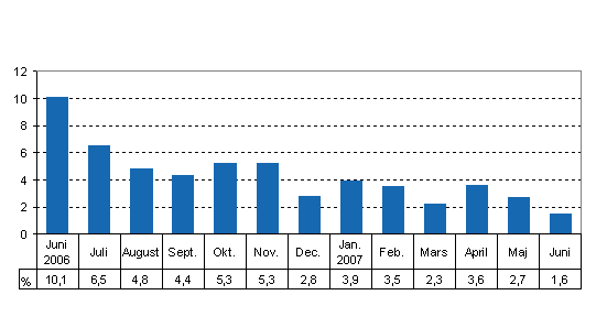 Enligt de ursprungliga serierna för volymindex för industriproduktionen gick industriproduktionen ned med 1,6 procent från juni år 2006. Produktionsvolymerna för hela metallindustrin ökade med 2 procent och dess undernäringsgren tillverkning av elektronik- och elprodukter med en procent. Produktionen inom trä- och pappersindustrin gick ned med fyra procent.