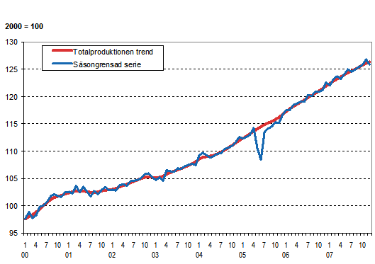 Volymen av totalproduktionen 2000-2007, trend och säsongrensad serie