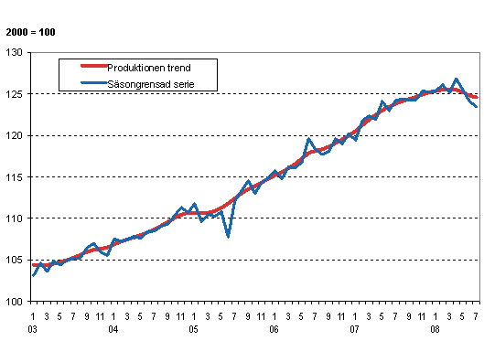 Produktionens volym 2003-2008, trend och säsongrensad serie
