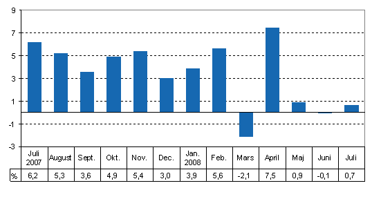 Förädlingen förutses ha ökat med sex procent enligt de ursprungliga serierna och med tre procent enligt den arbetsdagskorrigerade från juli året innan. Tjänsterna uppskattas ha varit en procent och primärproduktionen tio procent mindre än i juli år 2007. De arbetsdagskorrigerade tjänsterna och den arbetsdagskorrigerade primärproduktionen gick ned med två respektive 15 procent. Förädlingen omfattar industri och byggverksamhet. Tjänsterna omfattar handel, hotell- och restaurangverksamhet, samfärdsel, företagstjänster samt fastighets-, uthyrnings- och forskningstjänster, finansierings- och försäkringsverksamhet och offentliga tjänster. Med primärproduktion avses jordbruk, jakt, skogsbruk och fiske.