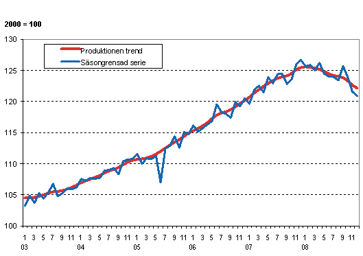 Produktionens volym 2003-2008, trend och säsongrensad serie