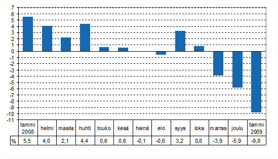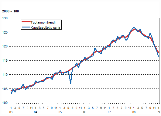Kausitasoitettu tuotanto väheni 1,8 prosenttia edelliskuukaudesta. Työpäiväkorjattuna tuotanto pieneni 9,8 prosenttia vuoden 2008 tammikuusta. Alkuperäisten sarjojen mukaan tuotanto oli 11,5 prosenttia pienempi kuin edellisvuoden tammikuussa. Vuoden 2009 tammikuussa oli kaksi työpäivää vähemmän kuin vuotta aiemmin. Tiedot käyvät ilmi Tilastokeskuksen tuotannon suhdannekuvaajasta. Tiedot ovat ennakollisia ja tarkentuvat jatkossa.