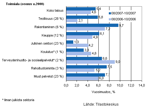 Lönesumman ökade inom alla huvudnäringsgrenar. Snabbast var ökningen inom byggverksamheten, där lönesumman under augusti-oktober var 9,7 procent större än under motsvarande period året innan. Lönesumman ökade gynnsamt också inom finansiell verksamhet (7,5 %), övriga tjänster (7,1 %) och privata hälsovårds- och socialtjänster (6,6 %) samt inom handeln (6,1 %). Långsammast var ökningen inom den offentliga sektorn (1,3 %) samt den privata sektor som tillhandahåller utbildningstjänster (3,3 %).