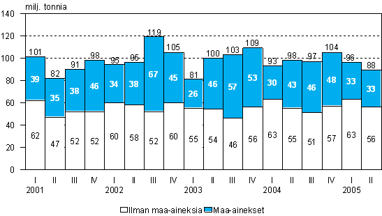 Vuoden 2005 tammi-kesäkuussa kuljetettu tavaramäärä oli 3 prosenttia pienempi kuin edellisen vuoden alkupuoliskolla. Maa-aineskuljetukset vähenivät 11 prosenttia, mutta muiden tavaroiden kuljetukset kasvoivat 2 prosenttia. Kuorma-autojen kuljetussuorite oli tammi-kesäkuussa prosentin edellisvuotista pienempi.