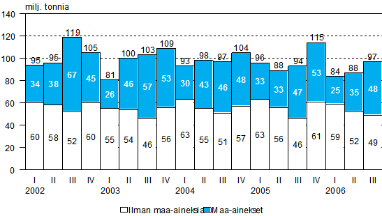 Kuorma-autoilla kotimaan tieliikenteessä kuljetettu tavaramäärä lisääntyi vuoden 2006 kolmannella neljänneksellä 4 prosenttia vuoden 2005 vastaavaan ajanjaksoon verrattuna. Maa-aineskuljetukset lisääntyivät 2 prosenttia ja muiden tavaroiden kuljetukset lisääntyivät 6 prosenttia edellisvuodesta. Tiedot ilmenevät Tilastokeskuksen laatimasta kotimaan tieliikenteen tavarankuljetustilastosta.