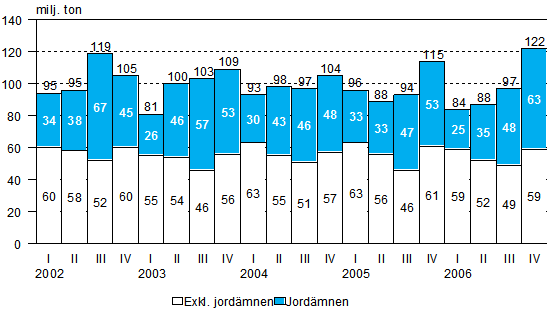 I oktober-december 2006 uppgick varutransporterna med lastbil till totalt 122 miljoner ton. Volymen av transporter av jordmaterial var 63 miljoner ton. Transport av andra varor uppgick totalt till 59 miljoner ton. Transport av jordmaterial ökade med 18 procent, men transport av andra varor minskade med 4 procent från året innan. Lastbilarnas transportarbete var 7 508 miljoner tonkilometer.