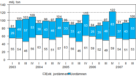 I juli-september 2007 uppgick varutransporterna med lastbil till totalt 106 miljoner ton, varav hälften var transporter av jordmaterial. Lastbilarnas transportarbete var 6 222 miljoner tonkilometer, vilket ökade med 5 procent från året innan.